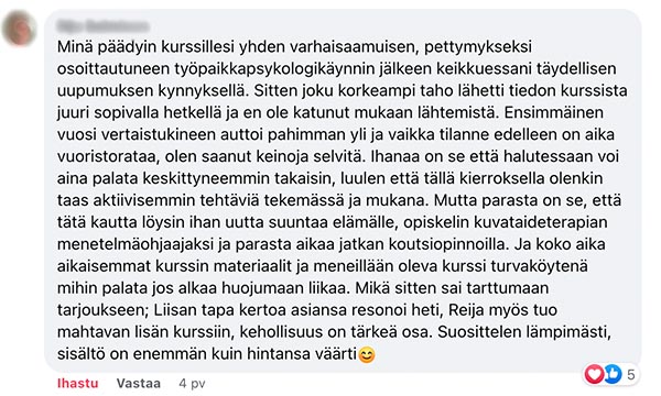 Valmennuksella on 100 % tyytyväisyystakuu 30 päivän ajan. Voit siis testata rauhassa ilman riskiä, soveltuuko se sinulle.